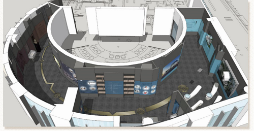 展廳內(nèi)墻面的顏色由深灰色過渡到淺灰色,到藍(lán)色,再到淺藍(lán)色,象征著醫(yī)院的發(fā)展從過去的灰暗走向未來明亮的康莊大道;