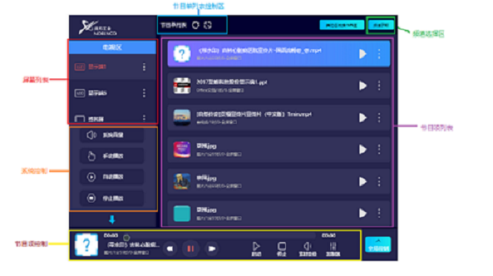 2、節(jié)目項(xiàng)列表區(qū):對(duì)應(yīng)屏幕節(jié)目單所有節(jié)目,點(diǎn)擊任意節(jié)目后面的播放按鈕即可播放該節(jié)目單內(nèi)容到對(duì)應(yīng)屏幕上。
