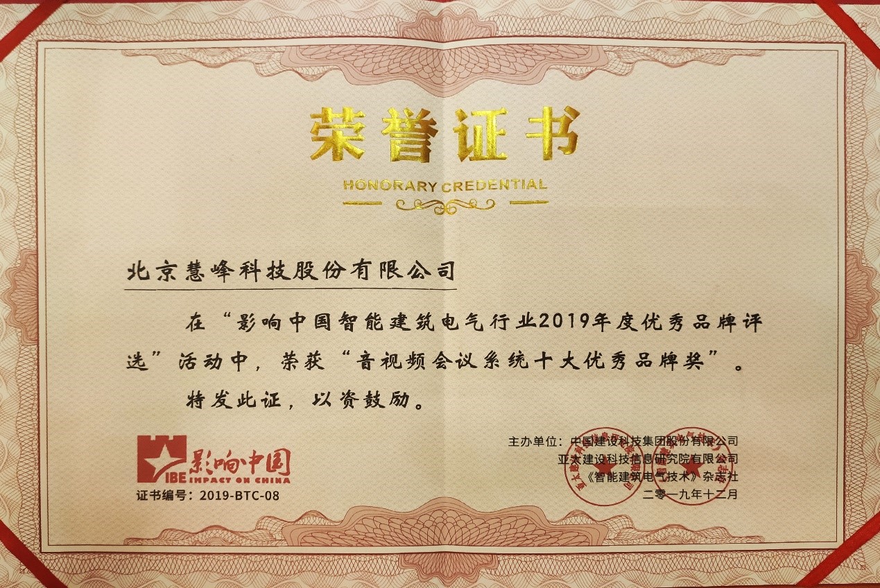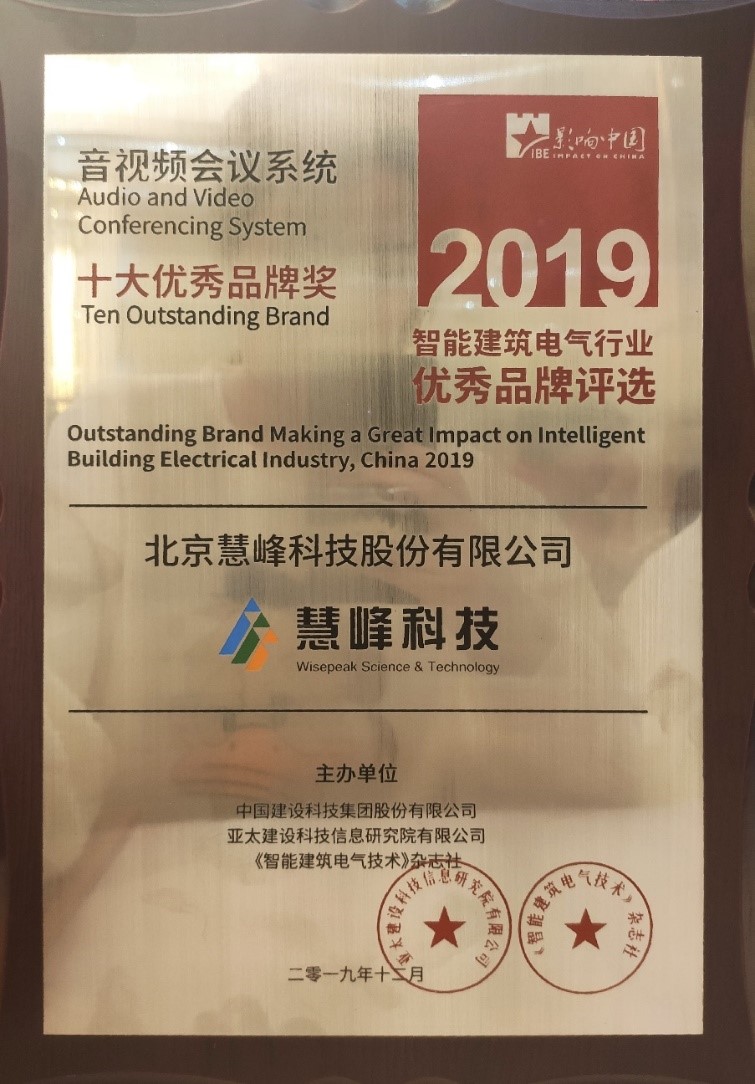 2019年12月20日第八屆「影響中國」智能建筑電氣行業(yè)優(yōu)秀品牌評選頒獎典禮在北京華麗落幕。智能建筑行業(yè)協(xié)會的領(lǐng)導、專家評委、優(yōu)秀品牌廠商代表、媒體代表等齊聚一堂,共同見證了此次頒獎盛典?;顒咏M委會從參評的全國智能建筑電氣行業(yè)的465個參評品牌評選出“十大系統(tǒng)優(yōu)秀品牌獎”,慧峰科技榮獲“音視頻會議系統(tǒng)優(yōu)秀品牌獎”,這是繼慧峰科技2019年12月19日榮獲“2019年中國弱電運維行業(yè)音視頻服務(wù)企業(yè)十大品牌獎”之后的又一殊榮。